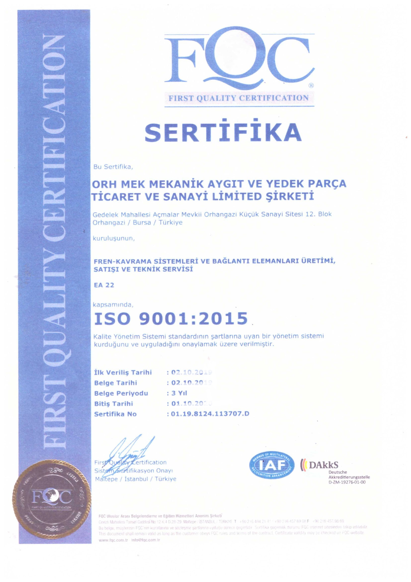 Dünyada bilinirliği en yüksek kalite yönetim standardı olan IS0 9001 Kalite Yönetim Sistemi, kuruluşların müşteri memnuniyetini artırmasına yönelik olarak geliştirilen, Uluslararası Standartlar Organizasyonu (ISO) tarafından yayımlanmış olan bir standartlar bütünüdür. ORH MEK ekibi olarak, iş sürecinde ortaya çıkabilecek hataları azaltmak, ortadan kaldırmak ve en önemlisi oluşabilecek hataları ön görmek ve önlemek amacıyla etkin bir Kalite Yönetim Sistemi oluşturduk.